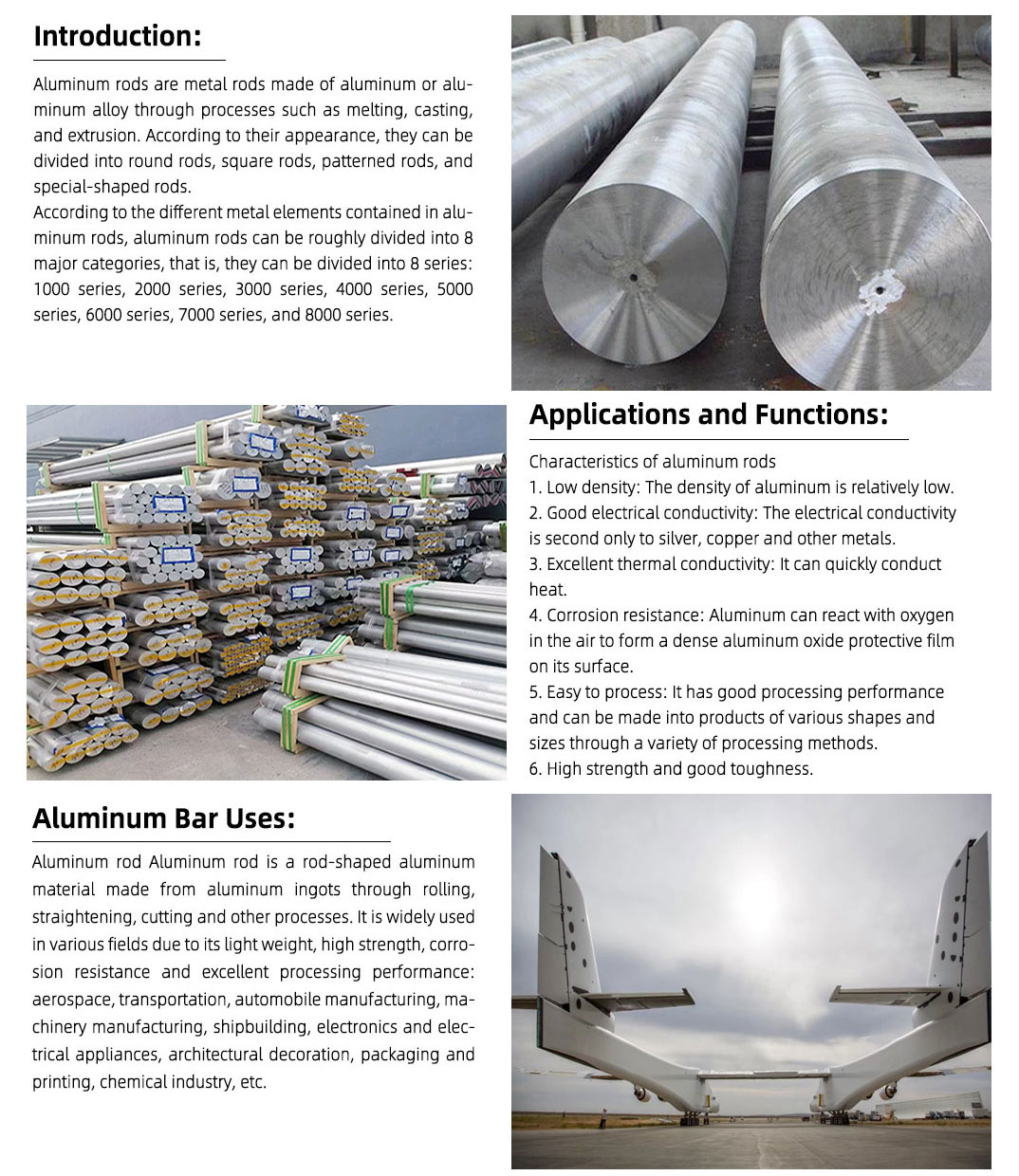Aluminum rod is a rod-shaped aluminum material made from aluminum ingots through rolling, straightening, cutting and other processes. It is widely used in various fields due to its light weight, high strength, corrosion resistance and excellent processing performance: aerospace, transportation, automobile manufacturing, machinery manufacturing, shipbuilding, electronics and electrical appliances, architectural decoration, packaging and printing, chemical industry, etc.