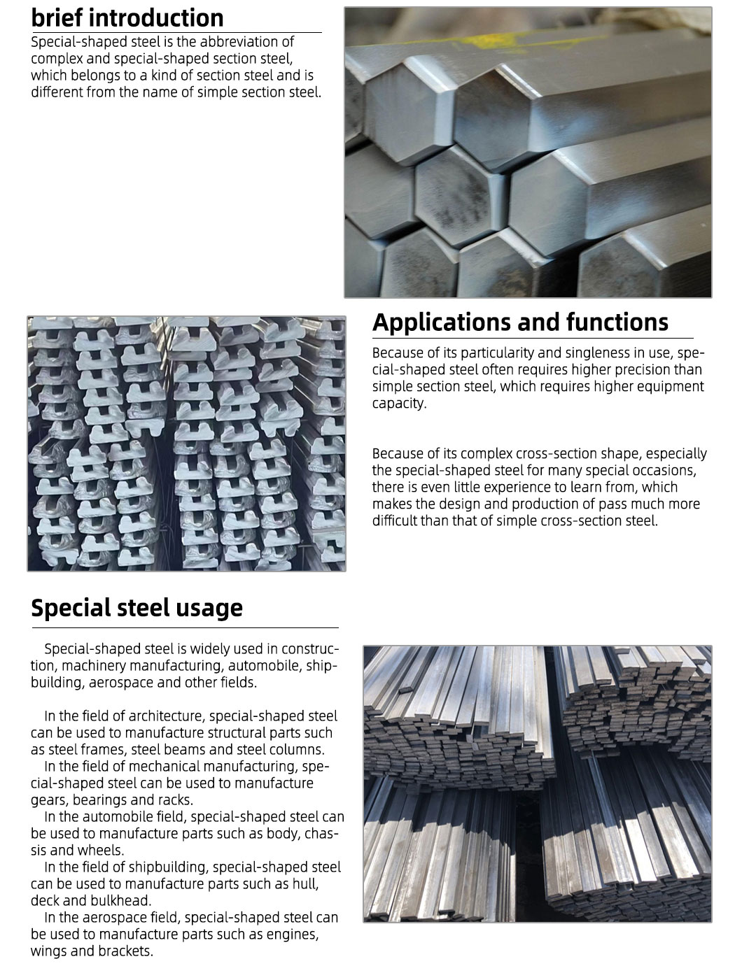 Special-shaped steel bars have unique shapes and properties. They are mainly divided into three types: hot rolling, forging and cold drawing. Due to their high strength, corrosion resistance and plasticity, they are widely used in various fields: construction engineering, bridge engineering, automobile industry, mechanical equipment, oil and gas industry, aerospace industry, power industry, manufacturing industry, railway engineering, metallurgical industry, etc.