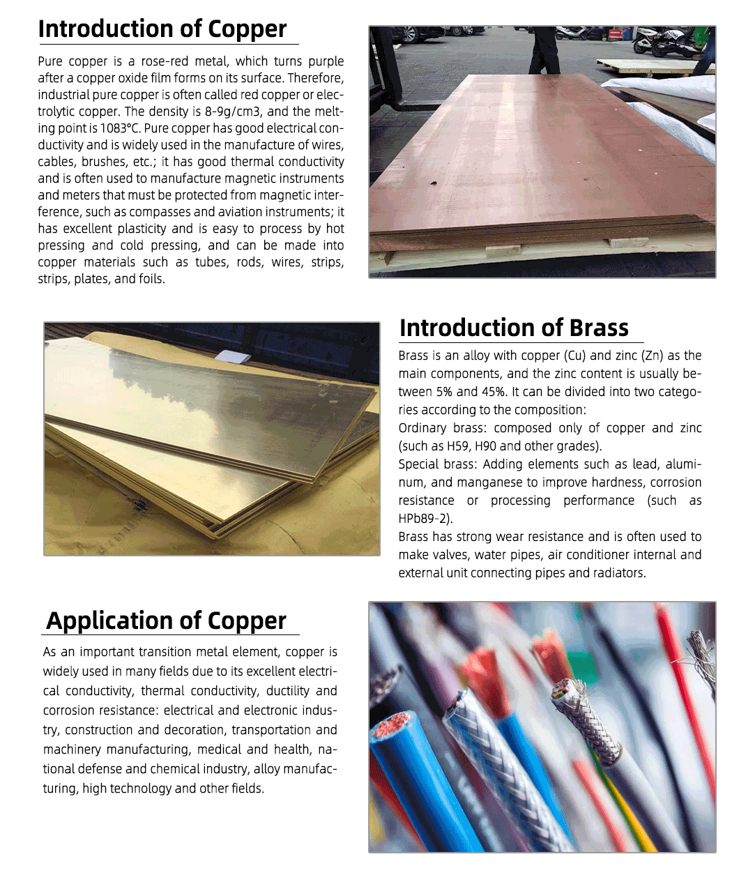 | Product Advantages | Copper is a very ductile and malleable metal. It is high electrical conductivity and high thermal conductivity. Copper alloy has excellent cold and hot working properties, can be heat treated and strengthened, has high strength and good elasticity, and is mainly used for busbars, wires, and parts that require high conductivity and good weldability. Brass plate has a high corrosion resistance, and have good plasticity,in the air easy to cold and hot pressure processing, easy to welding, forging and tin, no stress corrosion cracking the tendency. |