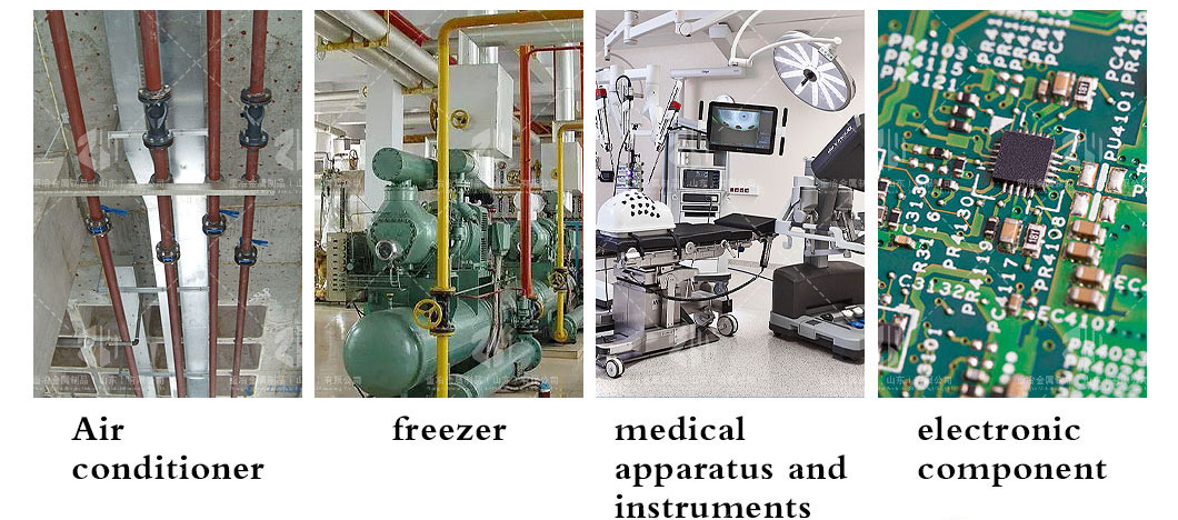 | Application | Copper pipe is the first choice of residential housing water pipes, heating, cooling pipes installed. Copper products are widely used in aviation, aerospace, ships, military industry, metallurgy, electronics, electrical, mechanical, transportation, construction and other fields of the national economy. |