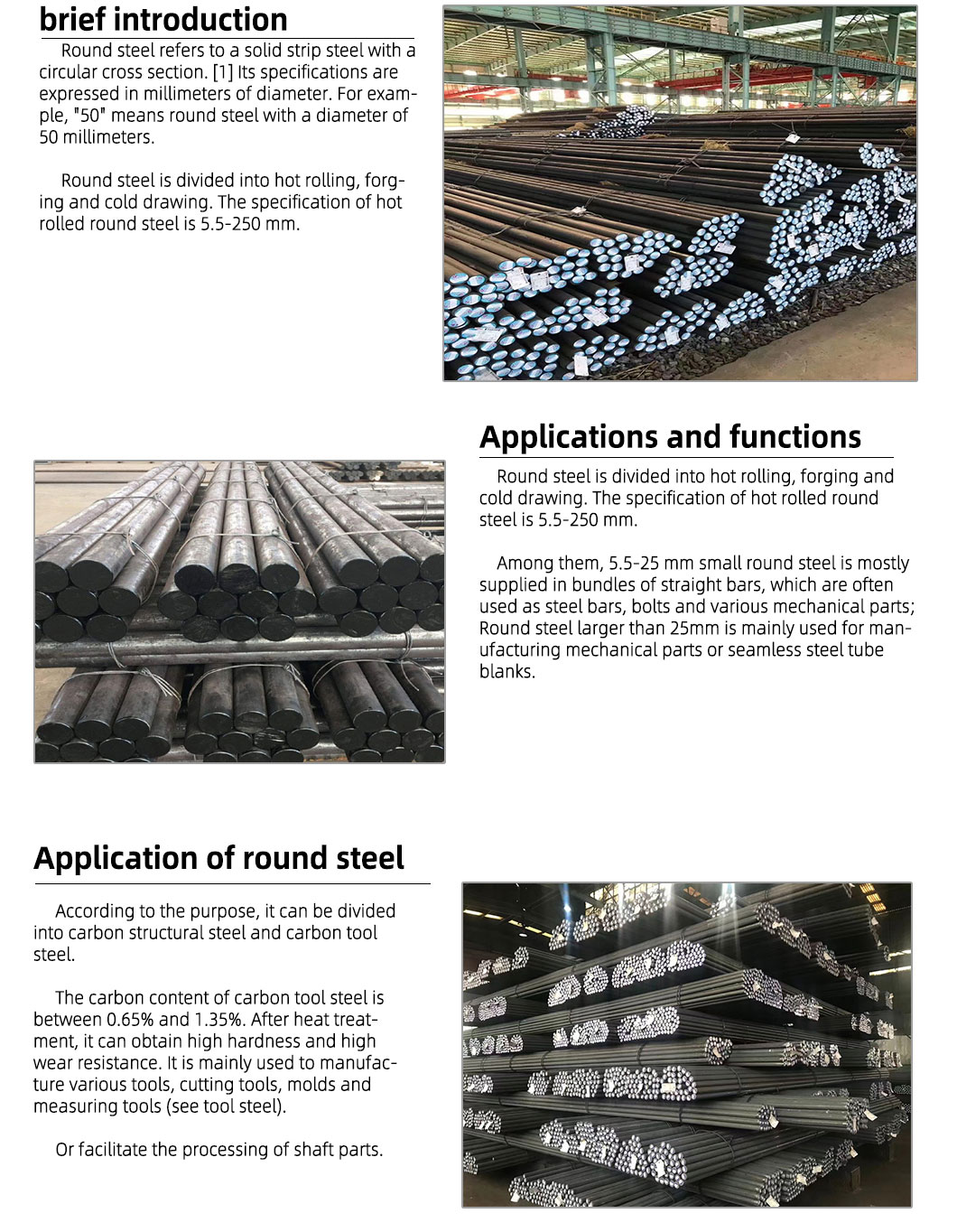 Classification of round steelRound steel is divided into hot rolling, forging and cold drawing. The specification of hot rolled round steel is 5.5-250 mm. Among them, 5.5-25 mm small round steel is mostly supplied in bundles of straight bars, which are often used as steel bars, bolts and various mechanical parts; Round steel larger than 25mm is mainly used for manufacturing mechanical parts or seamless steel tube blanks.